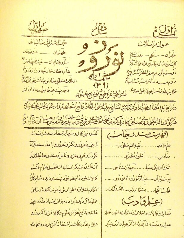 “Nawrūz” was established in 1320 AH (lunar calendar) under the management of “Mīrzā Muḥammad Kirmānī”, known as “Nāẓim al-Islām”, who was the supervisor of the school, and with “Mīrzā Kāẓim Khān Ṭabīb Kirmānī” as its secretary. It was published weekly until 1322 AH (lunar calendar). This periodical featured articles about schools, scientific and literary matters, public benefits, as well as useful announcements for the nation that were not contrary to the government’s interests.